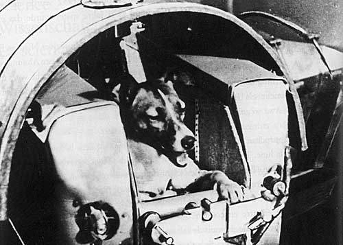Ο πρώτος σκύλος κοσμοναύτης με το όνομα Λάικα , δεμένος καλά στην θέση του στο διαστημόπλοιο sputnik 2